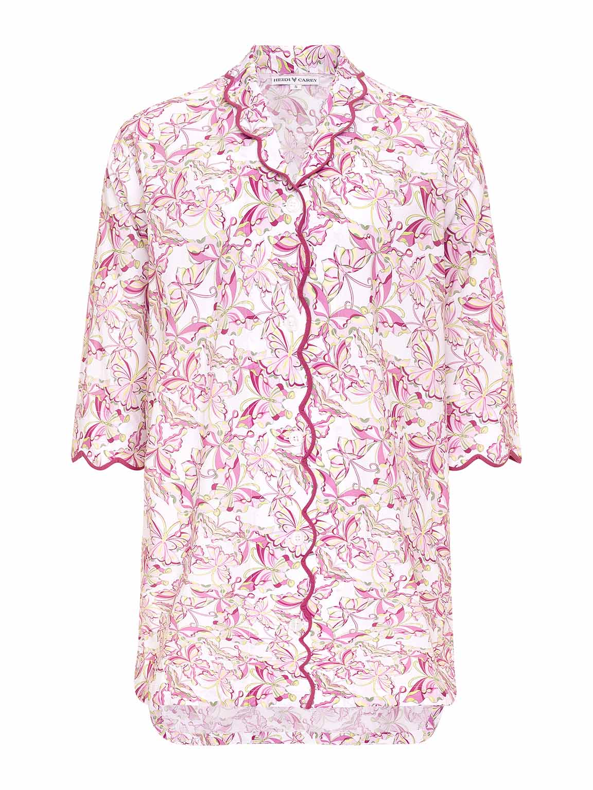Dressing for bed becomes a fashionable affair when you slip into Heidi's bestselling classic nightshirt, offered here in my hand-drawn Pink Butterfly print that evokes the charm of Heidi's childhood memories—sunny afternoons with her beloved governess Madie, quietly watching butterflies—and the vibrant, elegant Pucci prints of her youth Handcrafted in 96% soft Indian cotton 4% lycra, this piece earns its place in your nightly lineup by weaving in subtle details like three-quarter sleeves and a rounded hem, immediately bringing a sense of luxury to a timeless silhouette. Handcrafted by skilled artisans in India.