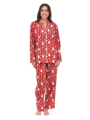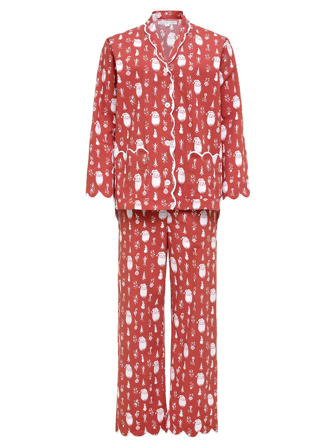 Did you know the average woman spends nearly 26 years of her life in bed? Make every one of those nights count with my flattering 2-piece red santa print pajama set, designed for the ultimate beauty rest. Handcrafted by skilled artisans, each set features exquisite hand-block printing on 98% soft Indian cotton and 2% lycra for an added stretch. Crisp and durable, yet light enough for warmer temperatures. Fabric becomes softer after each wash, improving in comfort with age. The straight-fit design, adorned with elegant scalloped edges, gives you a flattering, feminine look without being constricting — so you stay cool and comfortable all night long.