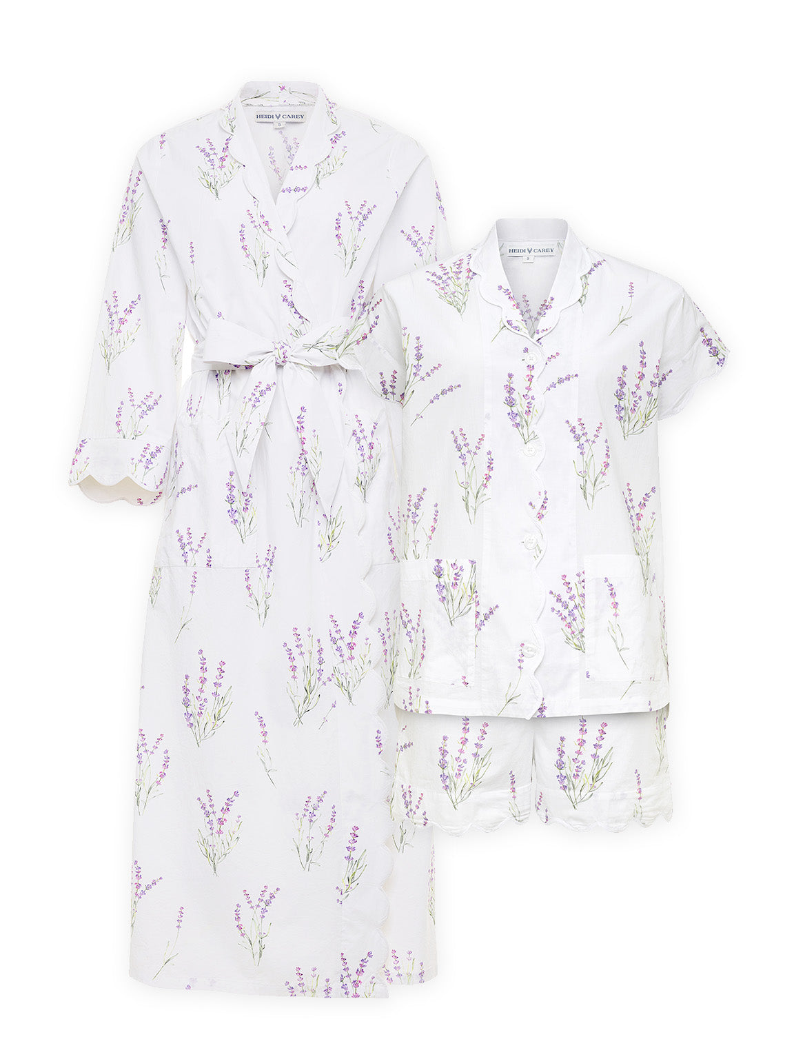 Indulge in luxurious comfort with the Lavender Set by Heidi Carey, featuring our Classic Robe and short pajamas. This sleepwear floral set is inspired by lavender farms in France and England, mixing elegance & coziness, perfect for relaxing at home. The graceful scallop design combined with the timeless straight silhouette and floral print makes it a work of art. Made from lightweight cotton, both the robe and short pajama offer a soft, breathable feel.