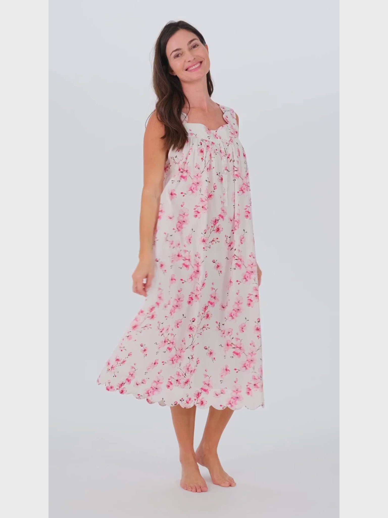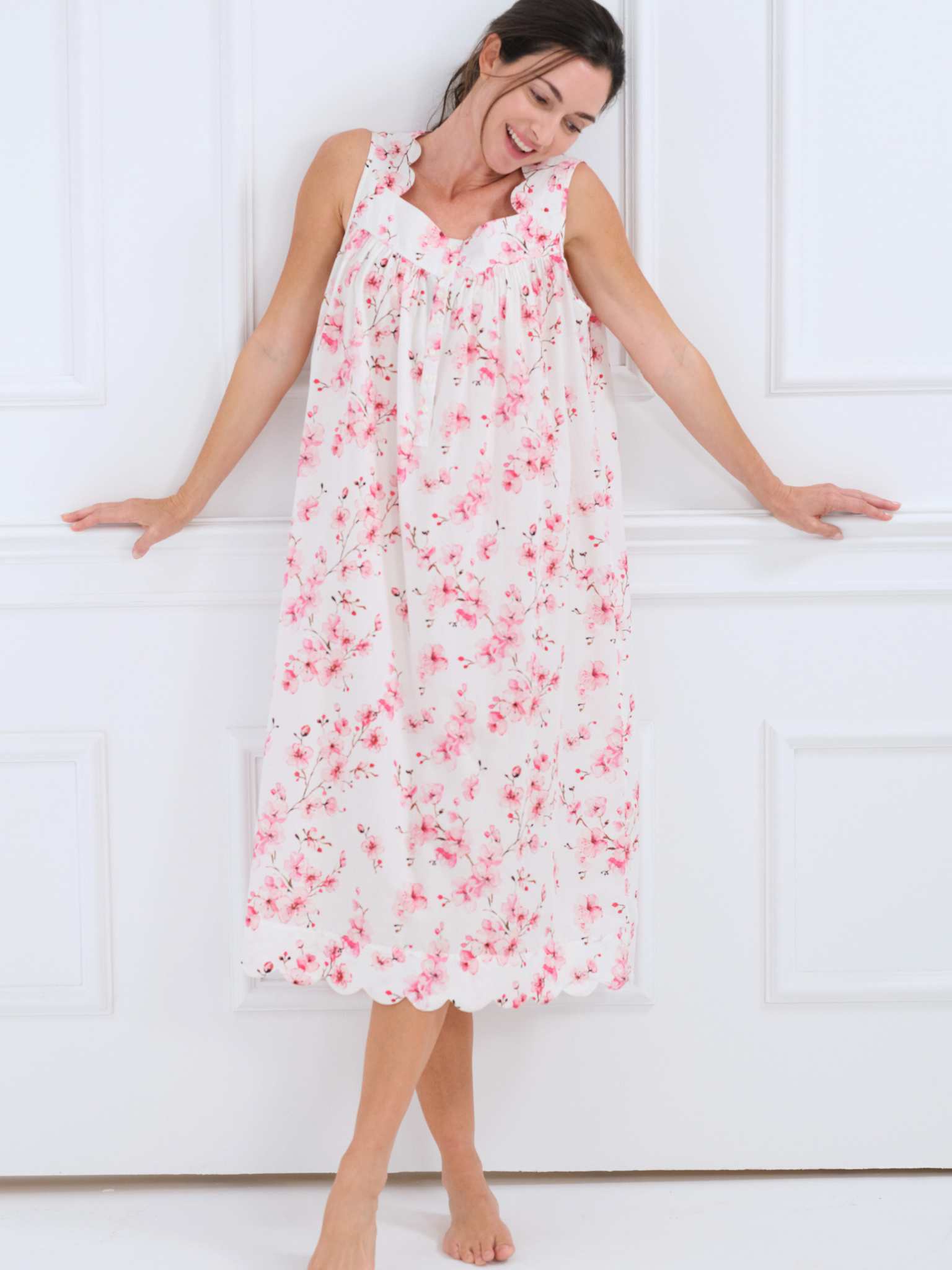 Forget pants and slip into the most enchanting nightgown in my signature Pink Cherry Blossom floral print. Made from soft, breathable cotton, this Cherry Blossom nightgown’s loose fit offers you unrestricted movement, making it easy to put on and take off. The wide straps provide extra support (and no accidental peek-a-boos), while the flowing design and feminine details, such as a scalloped trim and mother-of-pearl buttons, add a romantic touch.