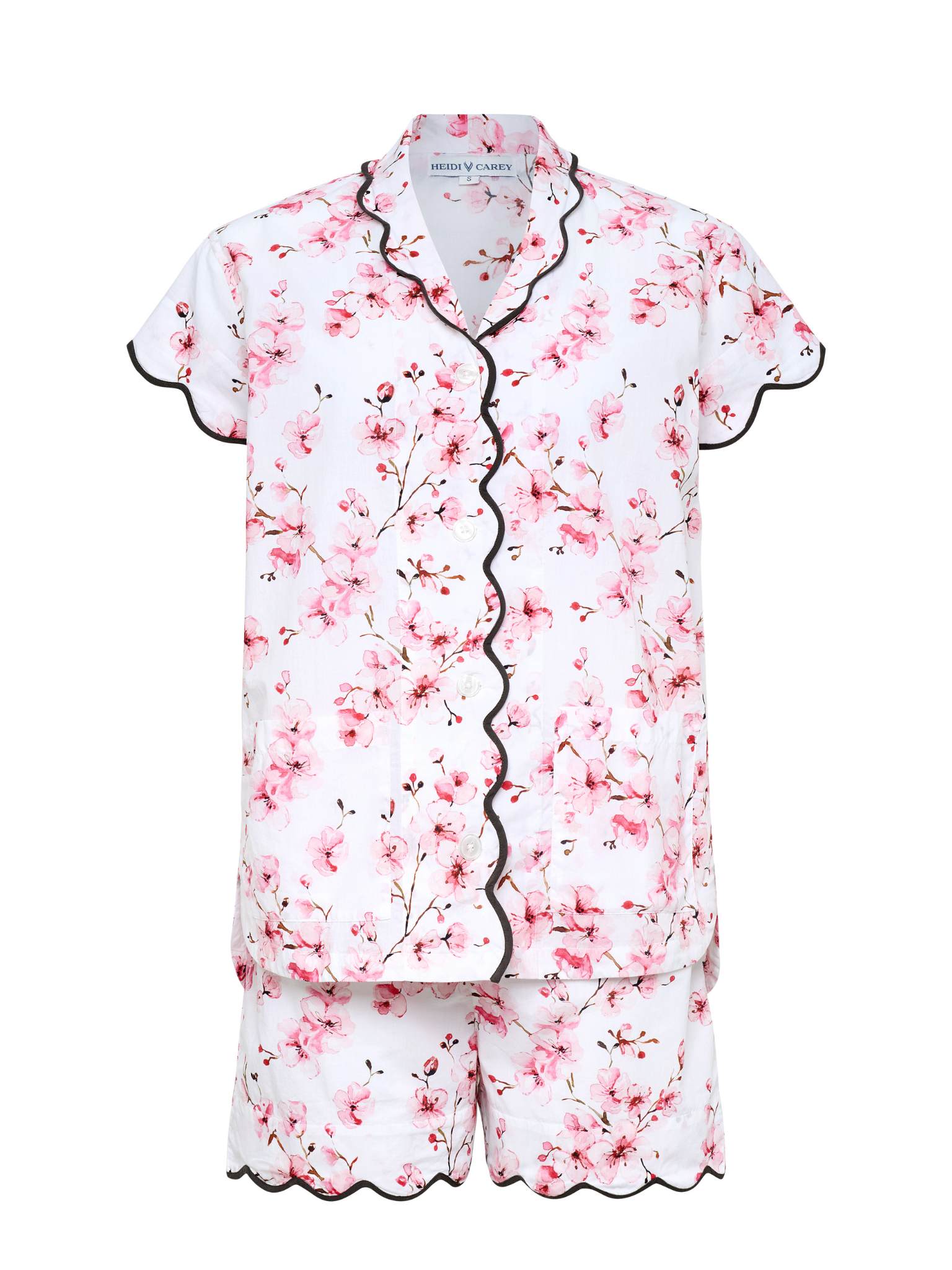 Did you know the average woman spends nearly 26 years of her life in bed? Make every one of those nights count with my flattering Floral print Cherry Blossom Short Sleeve Pajamas with Shorts. Designed by Heidi & handcrafted by skilled artisans, this short pajama features one of our best-selling prints: pink cherry blossom roint The straight-fit design, adorned with elegant scalloped edges, gives you a flattering, feminine look without being constricting — so you stay cool and comfortable all night long.