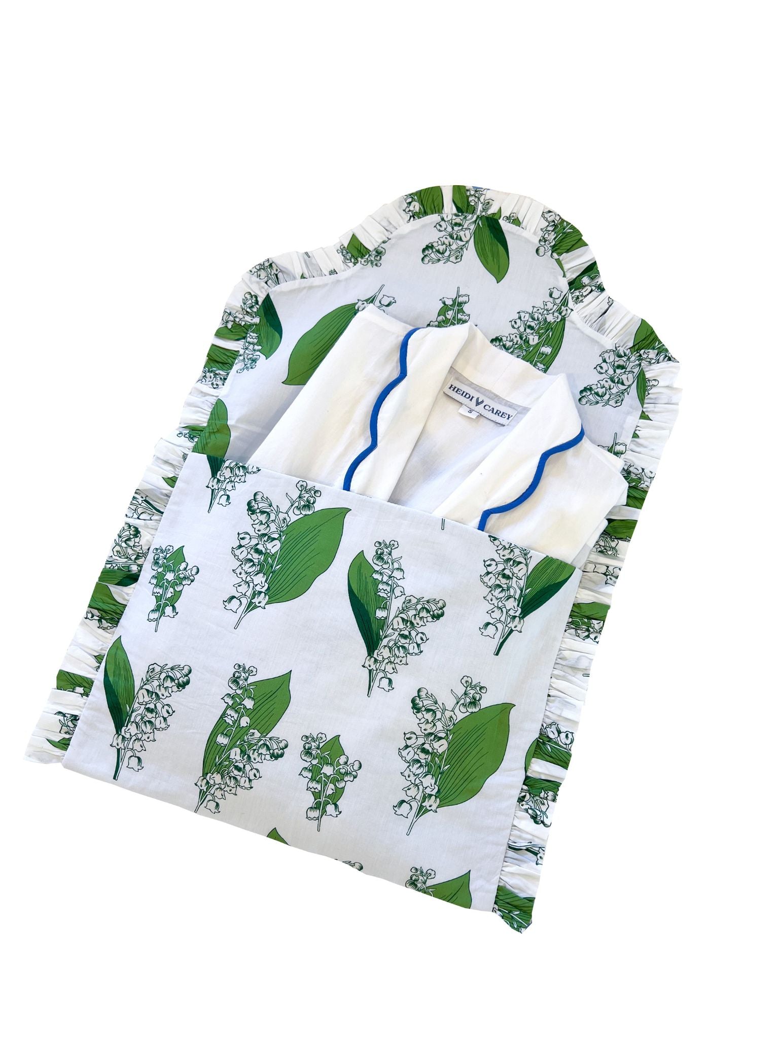 Give your delicates the care they deserve with our Lily of the Valley Lingerie Travel Bag, thoughtfully designed for both beauty and function. Made from soft cotton with light padding, this elegant bag protects your bras, underwear, and silk essentials from snags, crushing, and moisture. Featuring Heidi Carey’s signature lily of the valley print and a charming fringe detail, it’s a stylish addition to any suitcase or dresser drawer.